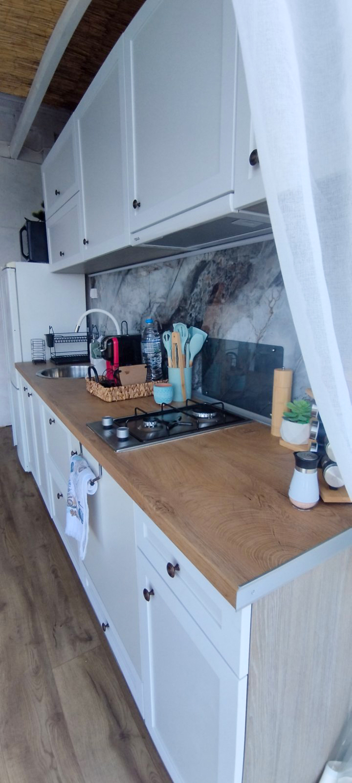Кухня оборудвана с хладилник с фризер, котлони, мултикукър, кафе машина с капсули, микровълнова, нови посуда.