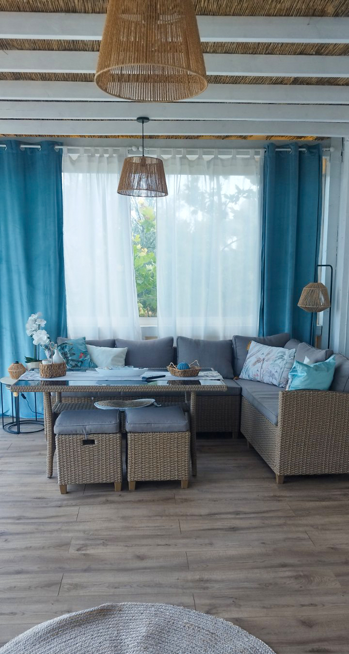 Голяма веранда към морето с кът за хранене и телевизор.