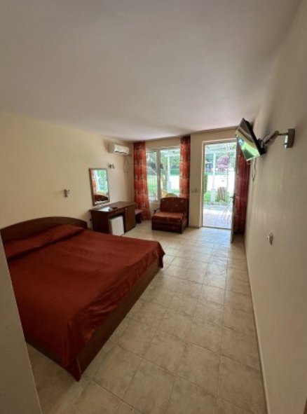 Стаята разполага със спалня ,гардероб с тоалетка . Собствен санитарен възел с душ, хладилник, телевизор с кабелна, INTERNET – Wi-Fi и тераса с маса и столове.