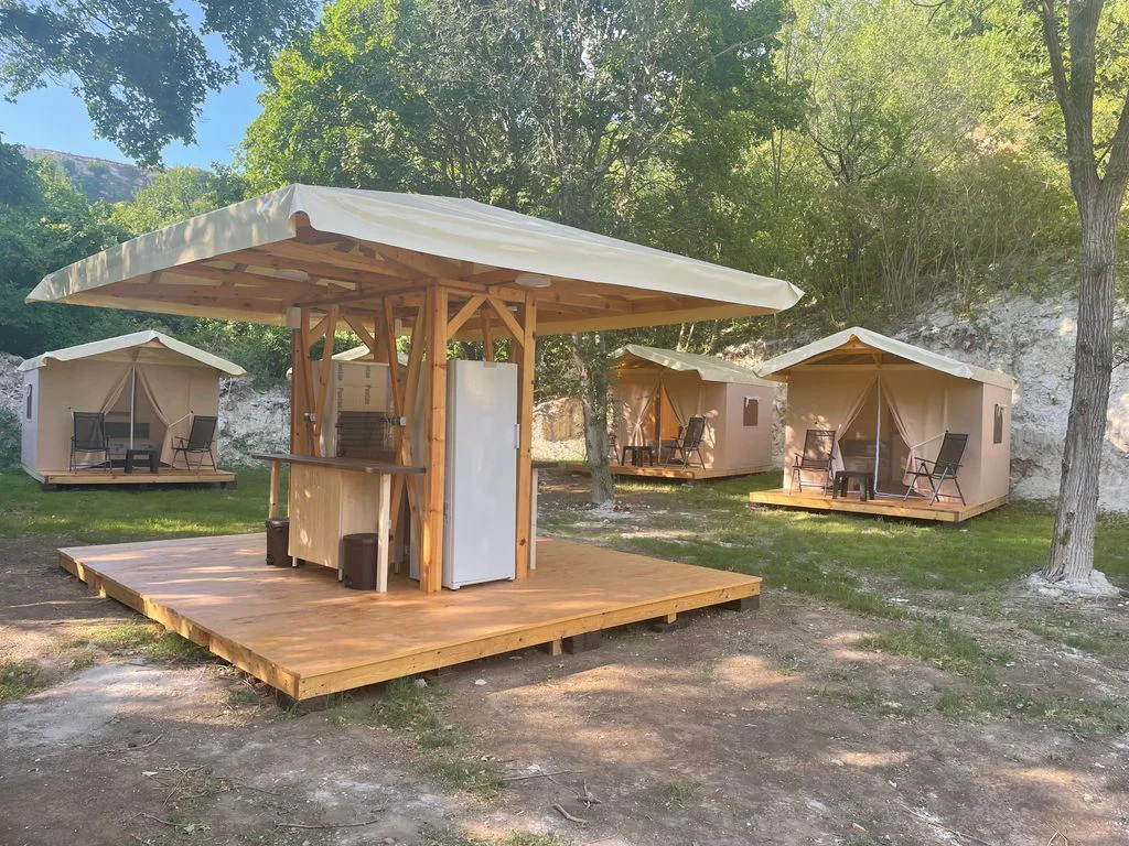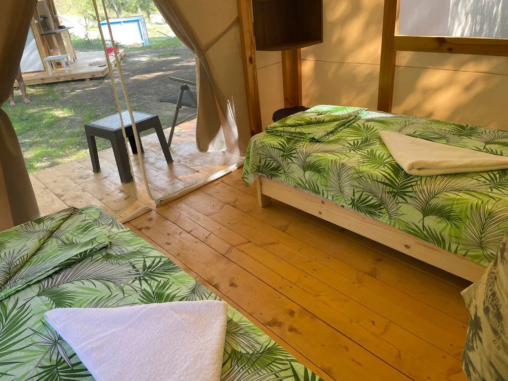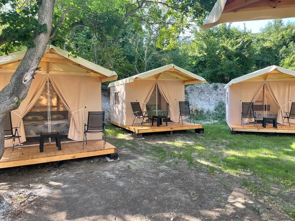 На ваше разположение са луксозни палатки, скрити в малка горичка на около м от плажната ивица. Палатките са двуместни и триместни. Триместните са със спалня и единично легло, а от двуместните можете да изберете със спалня или отделни легла. Кухнята е Обща и е оборудвана с хладилника, за да може да събере по-голяма част от храната и напитките на гостите. Има на разположение микровълнова, кана за вода, кафемашина, тостер. В зоната има отделна тоалетна и баня със собствен бойлер, които са на разположение на глемпингарите. Глемпинг зоната ни е подходяща както за семейни и приятелски събирания, така и за организиране на тиймбилдинг. В къмпинга има на разположение на гостите басейн, детски кът, заведение за хранене и много водни емоции. При наемане на палатките само за една или две нощувки, цената е лв/вечер за двойната и лв/вечер за тройната палатка.