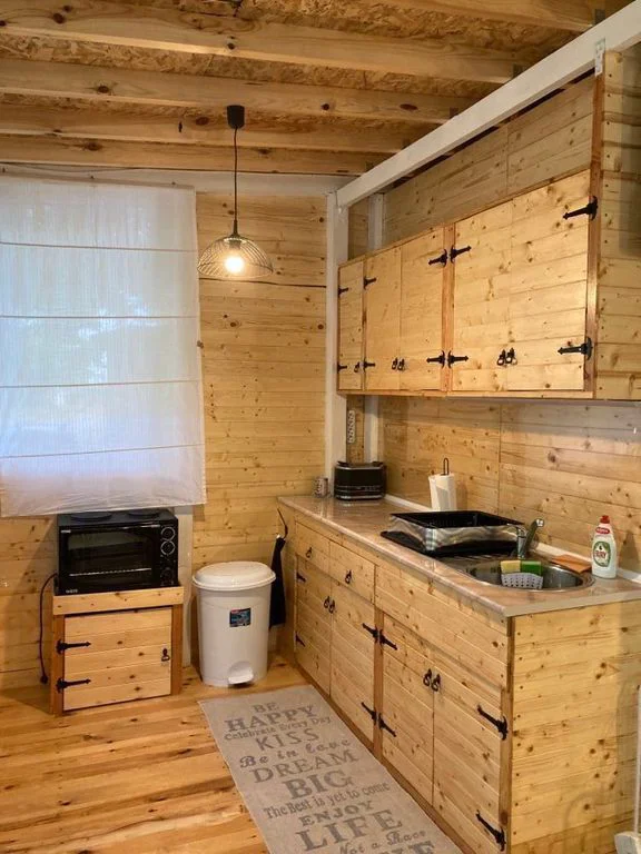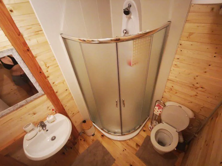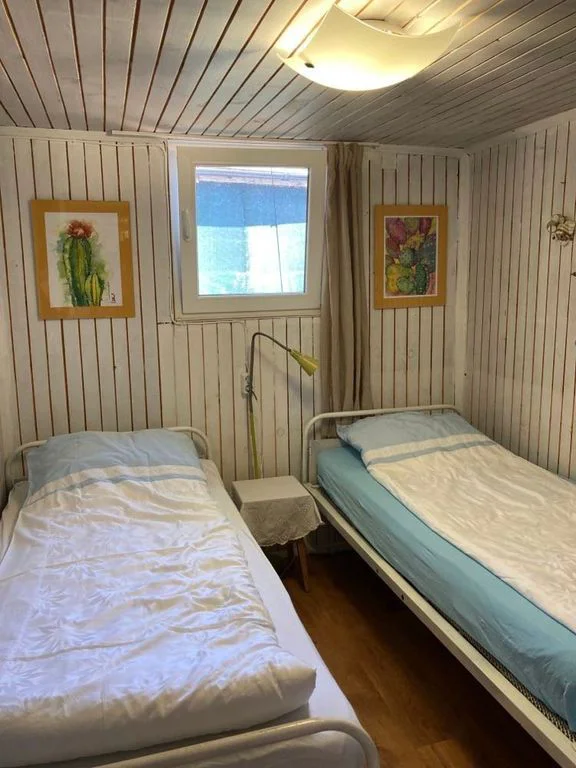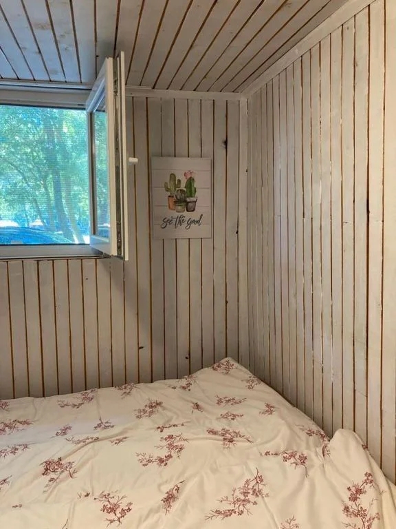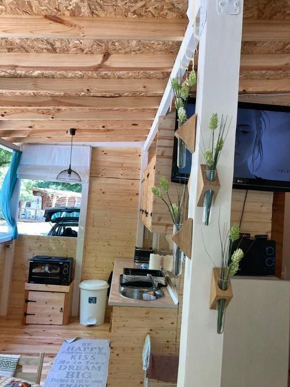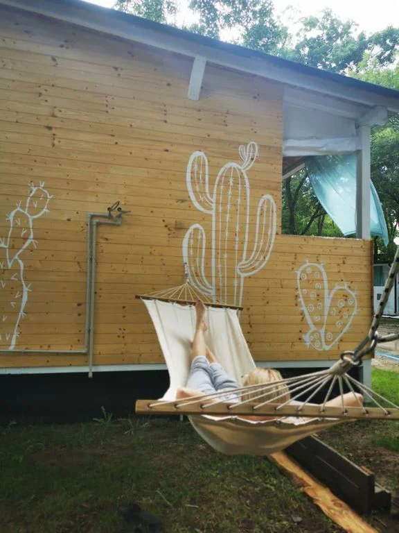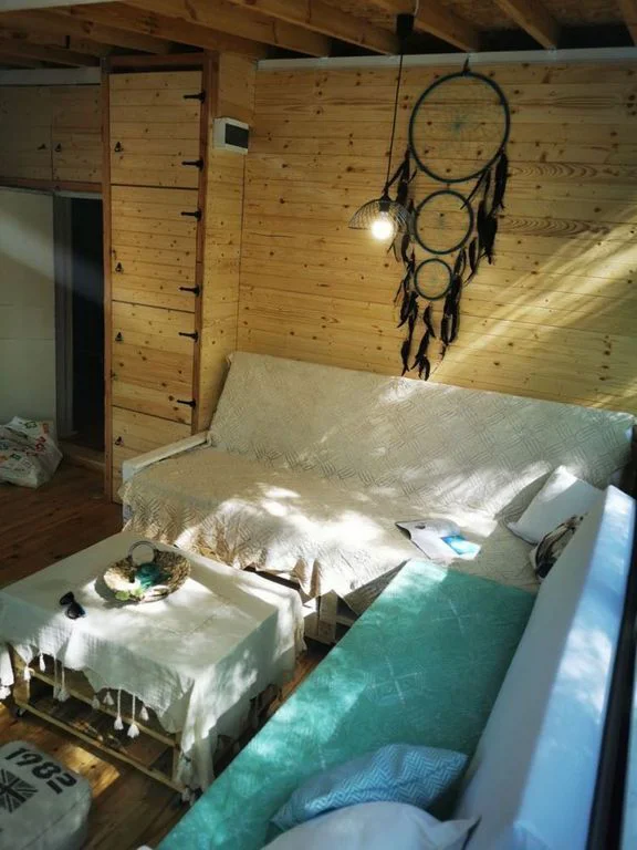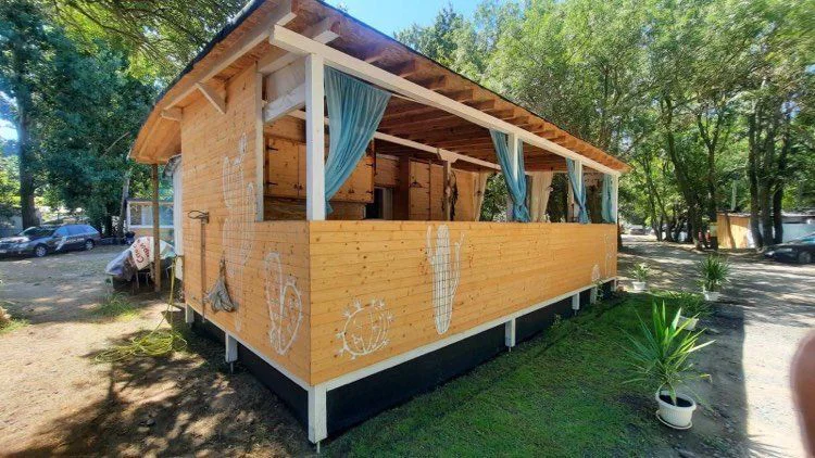 На м от Шарения плаж бунгало с две спални помещения – в едното две единични легла, в другото двойна спалня.Голям ъглов диван на верандата на който могат да спят още двама души.Собствен санитарен възел с топла вода.Оборудвана кухня, телевизор с кабелна.Домашни любимци са добре дошли – верандата има вратичка за непослушните.
